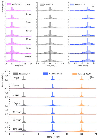 Synthetic rainfall distributions: (a): 2-h event, (b): 24-h event.