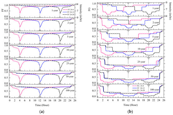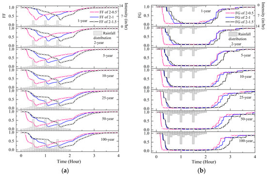 In terms of long-term rainfall events, the change process of FF is similar to that of short-term rainfall when leaving out the peak position. FF decreases slowly at the beginning of rainfall and sharply drops as rainfall approaches the peak value, and the minimum value of FF appears after the peak (Figure 4). However, FG displays different trends. The decrease in FG is still faster than that of FF, but it does not directly drop to the minimum value. FG drops dramatically to a lower level at short-term events and remains at the value until the end of the rainfall. For long-term events, especially in small rainfall events (e.g., less than 10-year events), FG falls step by step. With rainfall development, FG first decreases to approximately 0.4 and drops to the lowest value when the rain peak occurs. Combined with the rainfall peak value, the peak position significantly impacts FG and the falling speed of FF. Under the same rainfall amount, the later the rainfall peak appears, the slower the decreasing speed of FG is. When the rainfall begins to weaken, both FF and FG recover gradually. Unlike short-term rainfall events, the peak position has a more notable effect on the recovery of FF rather than FG since FG remains at a low value until the end of the rainfall. Nonetheless, FG begins to rise after the rainfall peak in the long-term rainfall.