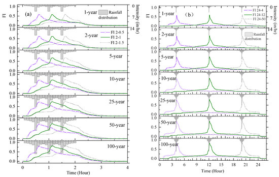 The variations in the fraction of road inundation in different rainfall patterns. (a) 2-h event, (b) 24-h event. The grey histogram shows the rainfall distribution, the purple curve with triangles indicates 2-0.5 and 24-4 events, the green lines indicate 2-1 and 24-12 events, and the dotted lines indicate 2-1.5 and 24-20 events.