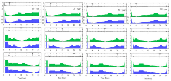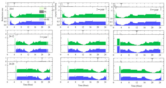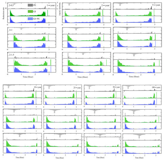The reduction rate of inundated roads is used to investigate the retrofitting effect. For short-term rainfall, Figure 7 shows the effect of GI, PE, and GI + PE under different rainfall patterns. Overall, PE is the least effective, and the performances of GI and GI + PE are better than PE. The function of the three mitigation measures gradually weakens with the increase in the return period. Especially in the 50-year and 100-year events, pipe retrofitting has little effect. The effect of mitigation measures is also affected by the time of the rainfall peak. At the beginning of rainfall, the three measures can reduce the amount of road inundation. GI can decrease road inundation by more than 50% during the first half-hour of rainfall. As rainfall increases, the capacity of mitigation measures gradually decreases. When the rainfall peak occurs, all three measures are almost invalid, and the number of flooded roads is the same as that of the baseline. GI and PE can alleviate road inundation with the decline in rainfall again, but this situation is not apparent under 50-year and 100-year events. For long-term rainfall, the control measures with GI perform better than those in short-term rainfall. The GI scheme lessens road inundation by more than half, except in a few cases (Figure 8). In contrast, the PE scheme is almost ineffective and worse than that under short-term conditions. Similar to short-term events, the influence of GI and GI + PE measures is limited when the rainfall is at a maximum. As the rainfall peak arrives, the number of inundated roads gradually increases. Therefore, peak position has a significant impact on the function of mitigation measures. Although the GI capacity diminishes slightly with the increase in the return period, the performance of GI in long-term events is more satisfactory than that in short-term events.