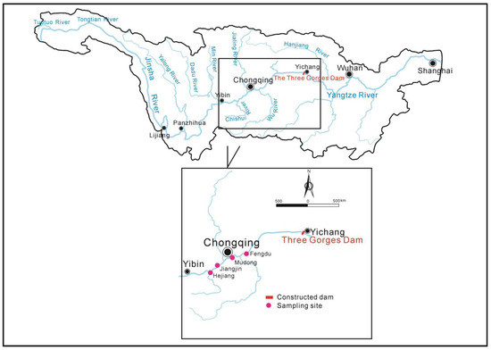 Samples were collected from four sites: Fengdu (29.874° N, 107.731° E), Mudong (29.577° N, 106.843° E), Jiangjin (29.348° N, 106.429° E), and Hejiang (28.805° N, 105.843° E) in June and July 2019. Fengdu and Mudong are located in the tail area of the TGR and are influenced by the operation of the TGR, and Jiangjin and Hejiang are in the upper reach of the TGR and are not influenced by the operation of the TGR (Figure 1). Individuals of R. cylindricus were collected using the gill net technique. All collected individuals were measured (total length, TL; standard length, SL, measured to the nearest 0.1 cm) and weighed (body weight, BW, measured to the nearest 0.1 g). The degree of digestive obturation was analyzed as described by Zhang [22]. Fish guts were then collected and stored in plastic vials at −20 °C until further analysis.