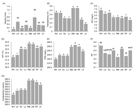 Histogram profiles of water physical and chemical factors in the sampling sites. (A), average water velocity in the sampling sites; (B), average water transparency in the sampling sites; (C), average dissolved oxygen (DO) of the water in the sampling sites; (D), average water temperature (WT) in the sampling sites; (E), average total dissolved solids (TDS) of the water in the sampling sites; (F), average water pH value in the sampling sites; (G), average water conductivity in the sampling sites. RH, right bank at Hejiang; LH, left bank at Hejiang. RJ, right bank at Jiangjin; LJ, left bank at Jiangjin; RM, right bank at Mudong; LM, left bank at Mudong; RF, right bank at Fengdu; LF, left bank at Fengdu. The different lowercase letters above the bars show the significant differences among the groups (p < 0.05).