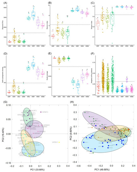 The changes in alpha diversity indexes (A–E), Weighted UniFrac distances (F), and water microbiota compositions (G) and Rhinogobio cylindricus gut microbiota compositions (H) as revealed by PCoA profiles, based on weighted UniFrac distance matrices at the operational taxonomic unit level. The different lowercase letters above the boxplots show the significant differences among the groups (p < 0.05). GMH, gut microbiota of R. cylindricus collected at Hejiang; GMJ, gut microbiota of R. cylindricus collected at Jiangjin; GMM, gut microbiota of R. cylindricus collected at Mudong; GMF, gut microbiota of R. cylindricus collected at Fengdu; WMH, water microbiota collected at Hejiang; WMJ, water microbiota collected at Jiangjin; WMM, water microbiota collected at Mudong; WMF, water microbiota collected at Fengdu; WLBF, water microbiota collected from the bottom of left bank at Fengdu; WLBH, water microbiota collected from the bottom of left bank at Hejiang; WLBJ, water microbiota collected from the bottom of left bank at Jiangjin; WLBM, water microbiota collected from the bottom of left bank at Mudong; WLSF, water microbiota collected from the surface of left bank at Fengdu; WLSH, water microbiota collected from the surface of left bank at Hejiang; WLSJ, water microbiota collected from the surface of left bank at Jiangjin; WLSM, water microbiota collected from the surface of left bank at Mudong; WRBF, water microbiota collected from the bottom of right bank at Fengdu; WRBH, water microbiota collected from the bottom of right bank at Hejiang; WRBJ, water microbiota collected from the bottom of right bank at Jiangjin; WRBM, water microbiota collected from the bottom of right bank at Mudong; WRSF, water microbiota collected from the surface of right bank at Fengdu; WRSH, water microbiota collected from the surface of right bank at Hejiang; WRSJ, water microbiota collected from the surface of right bank at Jiangjin; WRSM, water microbiota collected from the surface of right bank at Mudong.