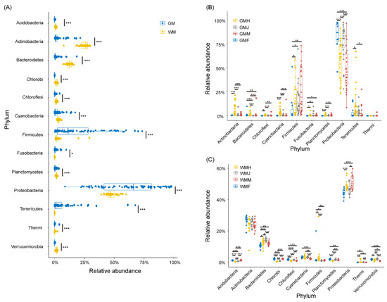 Phylum-level compositions of dominant water and Rhinogobio cylindricus gut microbiota. (A) Relative abundances of the dominant phyla of water and R. cylindricus gut microbiota. (B) Relative abundances of the dominant phyla of R. cylindricus gut microbiota among different sampling sites. (C) Relative abundances of the dominant phyla in the water microbiota among different sampling sites. GM, gut microbiota; WM, water microbiota; GMH, gut microbiota of R. cylindricus collected at Hejiang; GMJ, gut microbiota of R. cylindricus collected at Jiangjin; GMM, gut microbiota of R. cylindricus collected at Mudong; GMF, gut microbiota of R. cylindricus collected at Fengdu; WMH, water microbiota collected at Hejiang; WMJ, water microbiota collected at Jiangjin; WMM, water microbiota collected at Mudong; WMF, water microbiota collected at Fengdu. *, p < 0.05; **, p < 0.01; ***, p < 0.001.