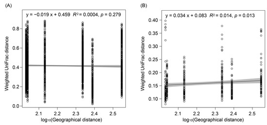 Changes in the UniFrac distances of the water microbiota (A) and Rhinogobio cylindricus gut microbiota (B) with geographical distance (km). The geographical distance represents the distance along the Yangtze River, not the straight-line distance. Geographic distances were converted into logarithm before the regression analysis.