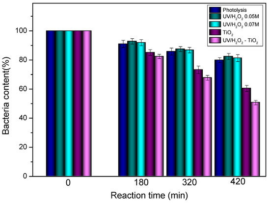 As also seen in Figure 2, heterogeneous photocatalysis induced by TiO2 is the more effective alternative for reducing bacteria concentration in the effluents. This resulted in removing 40% of the bacteria after 7 h of treatment. Different authors have reported that TiO2 photocatalysis promotes the peroxidation of the E. coli membrane phospholipids and induces major disorders in the cell membrane which could be the main mechanism for killing bacteria using this treatment [28]. Previous publications showed the destruction of bacterial cells during photocatalytic treatment using high-resolution microscopy [29,30]. The effectiveness of TiO2 in E. coli inactivation can also be related to different factors such as the size and shape of these microorganisms (this is because the bacteria are more than 30 times larger than TiO2 particles), concentration of TiO2 and microorganisms, nature, and intensity of UV irradiation [31].