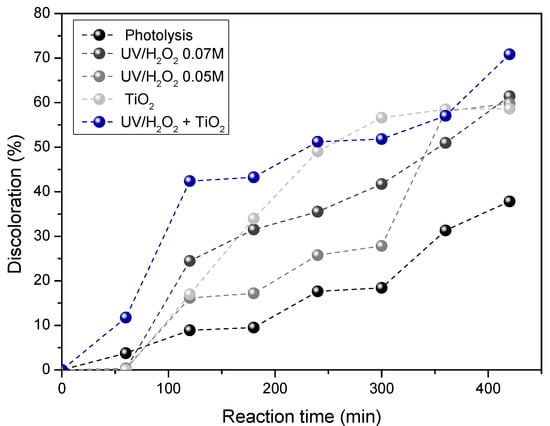 On the other hand, by using TiO2 as photocatalyst, the elimination of dyes after 7 h of illumination slightly decreases (58.63% of discoloration) compared to the results obtained by using 0.07 M peroxide. This is mainly due to the opacity generated inside the reactor given by the titania powders employed in the heterogeneous process. These powders cause a screening effect which reduces overall photonic efficiency [38].