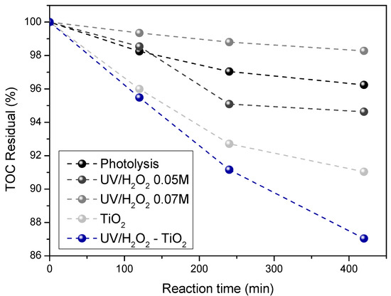 On the other hand, by using TiO2 photocatalysis, a lower TOC value compared to UV/H2O2 assays, was observed, thus showing the mineralization of other organic compounds present in the effluents. The mechanism for organic pollutant degradation under photocatalysis is based on the interaction between light and semiconductor particles. This produces ROS strong enough to destroy chemical pollutants in water by oxidation of the carbon chain mainly given by •OH radicals. As a result, the formation of short chain organic acids and the subsequent mineralization of them to obtain CO2 and water occur. A similar mechanism has been reported by Guo et al. by using phenol as a model molecule [40].