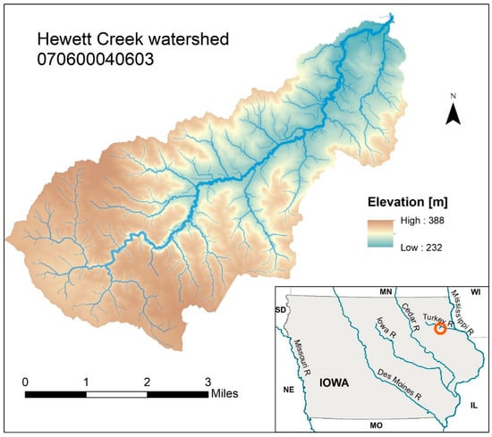 The study area is the Hewett Creek watershed, 12-digit Hydrological Unit Code (HUC) 070600040603, in northeast Iowa (Figure 2). Hewett Creek is a tributary of the Volga and Turkey River system. The watershed has a drainage area of 42.6 km2 (10,580 acres). The landscape is characterized by hills, with an elevation ranging from 385 m to 232 m, and an average slope of 10% calculated from a 1 m DEM. The watershed is rural and there are no inhabited centers. Approximately 36% of the area is cultivated, mainly in corn and soybean rotation. Grassland and pasture make up about 33% of the area, while forests cover 27%.