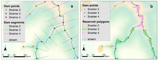 All reaches of Strahler order from 2 to 6 were considered for potentially installing a reservoir. We used ESRI ArcPy and GDAL [81] libraries to develop an algorithm generating reservoir objects in three steps. The first step identified points for locating dams and placed a dam segment across the streamline (Figure 4a). To maximize the number of reaches with at least one reservoir, we set a regular spacing between points of 100 m, starting 20 m from the start point of each reach. These choices resulted in 1154 locations.