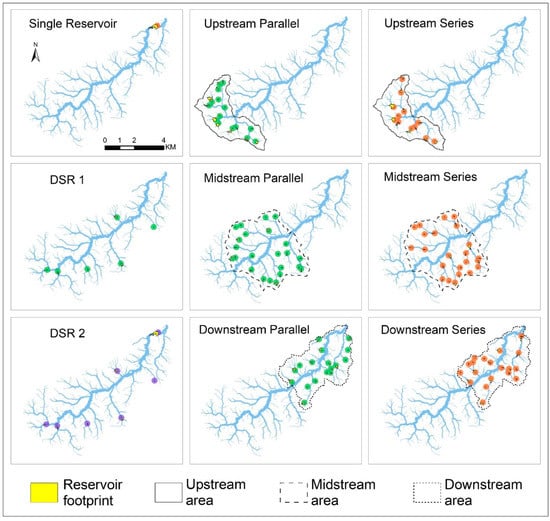 A spatial distribution of reservoirs, or DSR, is any feasible subset from the set of reservoirs modeled with the GIS-based algorithm. The only condition for feasibility is that no two reservoirs have overlapping footprints. Among the many possible distributions, we chose nine for this case study; they are displayed in Figure 6 and summarized in Table 1. The subsets have distinct spatial patterns to help understand the effect of the spatial dimension on the hydrograph.