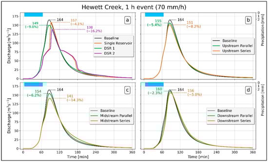 Figure 7a shows hydrographs for the Baseline, Single Reservoir, DSR 1, and DSR 2 distributions. As expected, the presence of reservoirs reduced the peak flow. A less obvious result is that DSR 1 generated a larger reduction in peak flow than Single Reservoir, even though the two have about the same storage capacity. Single Reservoir strongly regulated incoming flow at the beginning. Once it was full, discharge increased sharply, as no regulation occurred and the auxiliary spillway discharged water excess. By contrast, in DSR 1, attenuation occurred at multiple points and smoothed the flow to generate a lower peak than in Single Reservoir.