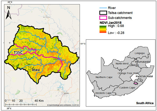 The Tsitsa River catchment is dominated by the grassland biome, whereas the Eastern valley bushveld thrives along river channels in the lower catchment [45]. The natural vegetation is primarily influenced by altitude and burning [41], and small pockets of the Afromontane forest occur along drainage lines and ravines, where fire has a minimal effect. The National Land Cover [46] database shows that over 60% of the catchment area is covered by grassland. Patches of natural forest also occur alongside forest plantations. Other minority land cover/uses include commercial and subsistence agriculture, water bodies, bare/degraded land, and urban and rural settlements [46].