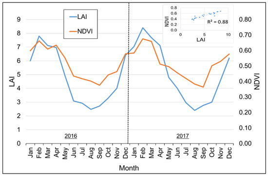 Distribution of monthly NDVI and LAI factor for 2016–2017.