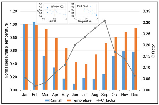 The relationship between normalised rainfall and temperature with C factor; insert linear regression of rainfall, temperature and C factor for 2016–2017. The climate values were normalised by dividing all values by the first value in the distribution (i.e., January).