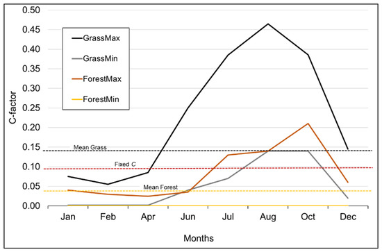 Differences in the intra-annual variations in the C factor were also analysed for the two most prominent natural vegetation cover classes: grass (74%) and thicket/forest (5%). This analysis was designed to assess which vegetation class was more variable, and thus might have a significant influence on the mean catchment C. Vegetation classes (e.g., cultivation [1.4%] and plantations [14.8%]) were not included because their temporal variation may depend on human influence and the management information with regards to planting and cropping is not easily accessible.