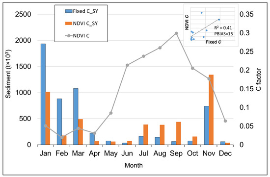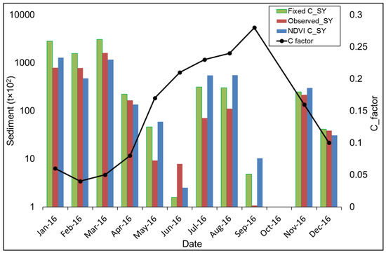 The results for 2016 (Figure 5) show that the fixed C factor yielded much higher sediment output than the variable C factor, with total annual sediment yields calculated as 5464 × 103 and 4625 × 103 tons, respectively. The major differences occur in the three main summer runoff months. These impacts are somewhat offset by higher sediment yields using the variable C factor in the winter and spring months when the C values are quite substantially higher than the fixed value. The results for 2017 (Figure 6) also display the typical seasonal variability exhibited in 2016. However, there is a larger difference between the total sediment yields simulated using the fixed (5203 × 103 tons) and dynamic (2871 × 103 tons) C factors. In 2017, the sediment generated during the two main summer months (January and February) is substantially reduced. There is little sediment generated during the winter. During November and December, the fixed and variable C values are similar. The analyses of the two years indicate that the differences between the use of fixed and variable C factor values are dependent upon the rainfall and streamflow regime during the year and whether the dominant erosion and transport events occur during the year when the variable values are close to, or very different from, the fixed estimates.