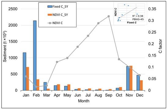 Figure 7 shows the results of the inter-annual analysis using annual variations in the C factor based on March NDVI data, compared with a fixed C value. The differences are substantially greater than those revealed by the intra-annual analysis based on 2016 and 2017. The variable C value results in approximately 85% less sediment compared to 16% and 45% less based on the intra-annual analysis for 2016 and 2017. This is a result that could have been predicted from the data provided in Table 3, which indicates that the March-based C values are only ~15% of the fixed value. The clear conclusion is that using a single month to determine the annual variability in C values is likely to be a very uncertain exercise.