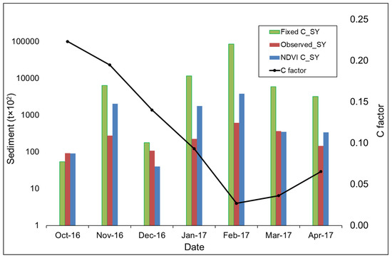 An illustration of observed sediment yield (SY) versus sediment calculated using the fixed and variable (NDVI) C factors in the Inxu catchment (Log Y-axis).