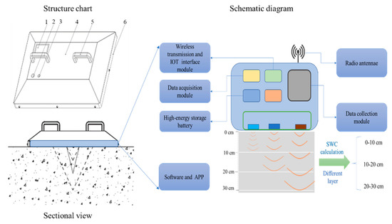 The device resembled a fixed-point measurement mode in terms of appearance and structural design. The equipment platform was fixed at a test point for long-term observation, and the sampling frequency could be adjusted to form 2D time distribution information of the SWC at the measured point. The device design diagram is shown in Figure 1 and covered an area of 0.6 m × 0.5 m.