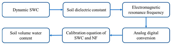 The critical technique of the instrument was an improved adjustable high-frequency oscillation method [21], based on the FDR principle [17,19]. In this study, the maximum resonance frequency was monitored by considering the soil as a capacitor, and the normalized resonance frequency (reflecting the soil dielectric constant) was related to the target SWC. Then, the measured SWC data monitored by the NIP-FDR were calibrated using the true SWC data monitored by the other mutable instrument [14]. Therefore, we were able to obtain the target SWC data using the NIP-FDR instrument (Figure 2).
