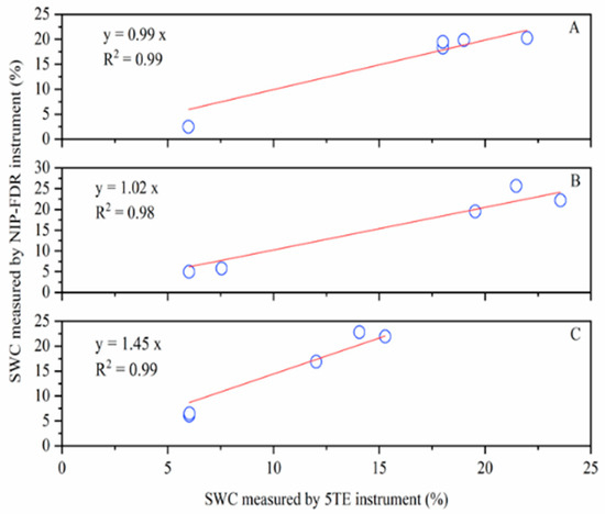 Comparisons of SWC measured by the NIP-FDR and 5 TE instruments. (A) 0–10 cm; (B) 10–20 cm; (C) 20–30 cm.