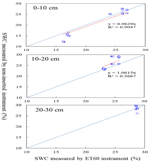 Soil water content is a key factor that limits crop growth and soil organic matter deposition [1,3]. In the cropland system, the roots of most crops, including wheat, maize, and beans, are distributed at depths of 0–20 cm. Therefore, it is necessary to monitor SWC in the surface soil of croplands. In this study, we developed an NIP-FDR instrument to measure cropland SWC at depths of 0–20 cm. The verification experiment showed that our instrument was effective for monitoring SWC at depths of 0–20 cm (Figure 3 and Figure 4). However, the linear regression of SWC data between the NIP-FDR and ET60 instruments was not significant at depths of 20–30 cm (Figure 4). This could be explained by the SWC in the 20–30 cm soil layer having no apparent variation during the short experimental period in summer, resulting from the lack of irrigation and precipitation.