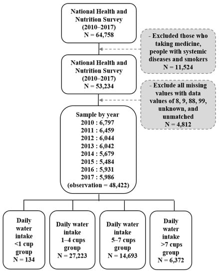 The sampling was performed using a two-stage, stratified, cluster extraction method with probability proportionality. Of the total 64,758, 48,422 people were selected, excluding those who were taking medication, those with systemic diseases, and smokers. Depending on the intake of water, 134 people in the ‘<1 cup’ group, 27,223 people in the ‘1–4 cups’ group, 14,693 people in the ‘5–7 cups’ group and 6372 people in the ‘>7 cups’ group were classified. There were no other ingredients added to the water, and the standard for 1 cup is 200 mL (See Figure 1).