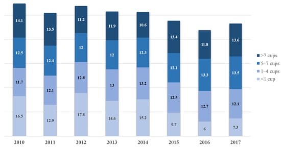The ratio of the ‘<1 cup’ group was highest in 2012, and the ratio of the ‘1–4 cups’ group was highest in 2014. The ratio of the ‘5–7 cups’ group was highest in 2017, and the ratio of the ‘>7 cups’ group was highest in 2010 (Figure 2). In the ‘<1 cup’ group and ‘>7 cups’ group, the ratio of ‘21–40 years old’ was higher, and in the ‘1–4 cups’ group and ‘5–7 cups’ group, the ratio of ‘41–60 years old’ was higher. In the ‘<1 cup’ group and the ‘1–4 cups’ group, the ratio of women was higher than that of men, and in the ‘5–7 cups’ group and >7 cups’ group, the ratio of men was higher than that of women. As for marital status, the ratio of married people was higher in all groups. In the ‘<1 cup’ group and ‘>7 cups’ group, middle-low income was highest. In the ‘1–4 cups’ group, low income was highest, and in the ‘5–7 cups’ group, middle income was highest. As for education, in the ‘<1 cup’ group, university graduate was highest, and in the ‘1–4 cups’ group, elementary school graduate was highest. In the ‘5–7 cups’ and ‘>7 cups’ groups, high school graduate was highest. In terms of economic activities, employed was higher than currently unemployed regardless of the group. There were significant differences in all items of demographic characteristics (Table 1) (p < 0.05).