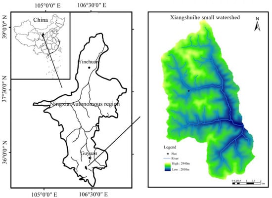 The study site for this investigation was in the small watershed of Xiangshuihe (106°12′–106°16′ E, 35°27′–35°33′ N) on the east slope of the southern section of the Liupan Mountains in Northwest China, with an area of 43.73 km2 and a temperate semi-humid climate (Figure 1). The average annual precipitation is 618 mm, of which 70% occurs from May to October; the average annual temperature is 5.8 ℃; the average annual wind speed is 3.09 m s−1; and the average annual air humidity is 68.8% (1981–2010). The soil type is mainly haplic greyxems soil. Natural secondary forests and artificial forests are the main vegetation types in the small watershed. Secondary forests account for 58% of the area, and the main tree species there are Pinus armandii, Quercus wutaishansea, Betula platyphylla, and B. albosinensis. Planted forests account for 24% of the area, and main tree species there is L. principis-rupprechtii, which accounts for 90% of the total planted forests, with small proportions of P. tabuliformis and Picea asperata.