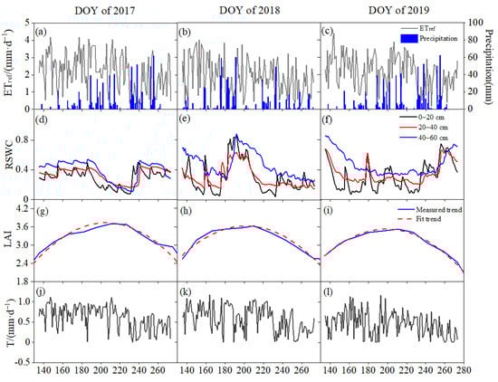 Daily variations of environmental factors (ETref and precipitation (a–c), RSWC at a depth of 0–20, 20–40, 40–60 cm (d–f), LAI (g–i), and T (j–l)) during the study periods in the plot of L. principis-rupprechtii from 2017 to 2019.
