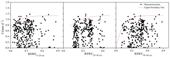 At the 0–60 cm soil depth range, the response of T to the different soil layers RSWC following a saturated exponential function (Figure 4). The T first increased slowly with the increase of RSWC until it reached the threshold, which was 0.34 in the 0–20 cm soil layer, 0.42 in the 20–40 cm soil layer, and 0.44 in the 40–60 cm soil layer. Then the increase showed a tendency to stop gradually. At this time, T reached its maximum response, which was 1.13 mm d−1, 1.13 mm d−1, and 1.17 mm d−1 at the 0–20, 20–40, and 40–60 cm soil layers, respectively. The response functions (Table 3) were determined by the upper boundary line.