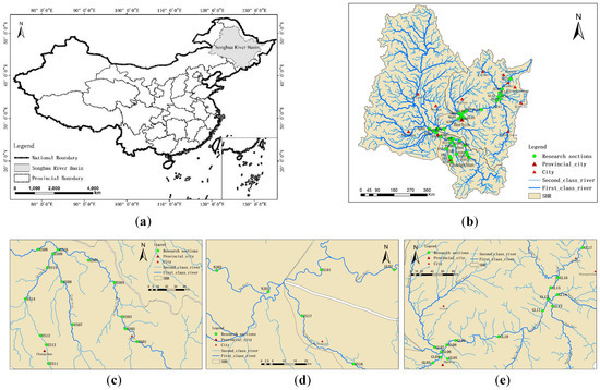 Sampling sections diagram. (a) Location of the SHR in China. (b) General sampling sections of the SHR. (c) Sampling sections the Jilin–Changchun river reach. (d) Sampling sections of in the confluence area of three rivers. (e) Sampling sections of the Harbin–Jiamusi river reach.