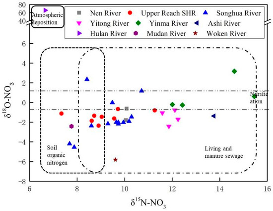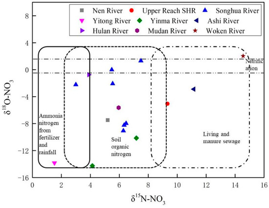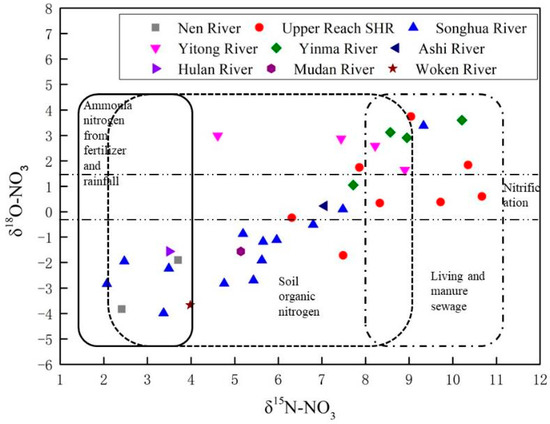 - The δ15N-NO3 and δ18O-NO3 of the Harbin region of the main stream of the SHR ranged from 3.00‰ to 11.15‰ and −2.88‰ to −0.01‰. The nitrogen upstream of the city comes from soil organic nitrogen, the nitrogen at GL05 of the Ashi River comes from domestic and manure sewage, and the main source of nitrogen at GL07 of the Hulan River is nitrogen fertilizer and soil organic nitrogen.