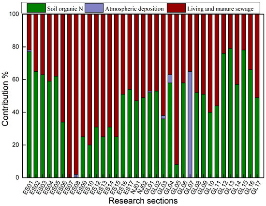 During the low flow season, input of soil organic nitrogen is the main source of nitrogen pollution upstream of the upper reach of the SHR, the main stream of the nonurban river section, and the Mudan River. For example, soil organic nitrogen contributed 77% to ES01, 79% to GL13, and 78% to GL15. Atmospheric deposition contributed 2% of nitrogen pollution, mainly in GL07 (65%).