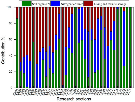 The nitrogen source of the main stream in the region downstream of Harbin, the Ashi River, and Hulan River is mainly from nitrogen fertilizer and domestic and manure sewage. For example, the contribution rate of domestic and manure sewage at GL06 was 40%, and that of nitrogen fertilizer is 41%. The contribution of nitrogen fertilizer at GL07 and GL14 reached 64% and 68% respectively. The contribution rate of nitrogen fertilizer at GL04 was 57%, and that of domestic and manure sewage was 30%. The contribution rate of nitrogen fertilizer at GL10 was 52%, and that of domestic and manure sewage was 48%.