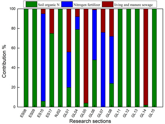 Soil organic nitrogen was the main source in the nonurban sections during the high flow season. For example, the soil organic nitrogen contribution rate of ES01 upstream of Jilin city was 86%. In the intersection area of the Nen River and the Second SHR, the contribution rate of soil organic nitrogen was about 61%, with the peak value at NJ01 (100%). The contribution rate of soil organic nitrogen from Yilan to Jiamusi region was about 76%, and the peak values were at GL16 (100%) and GL17 (100%). These areas are less affected by human activities, and most are main stream areas with a high and fast water flow rate, where river bank soil organic nitrogen is more likely to enter into water.