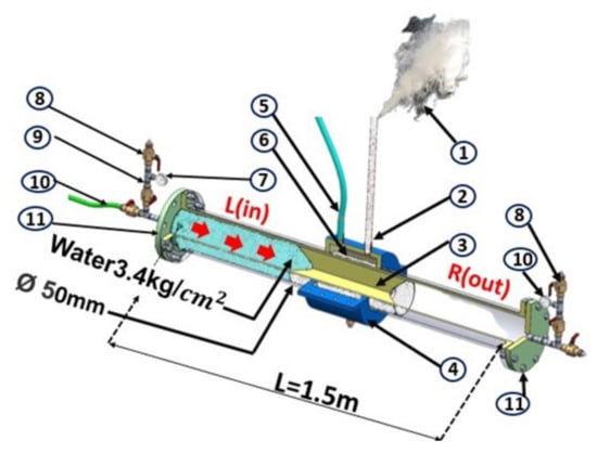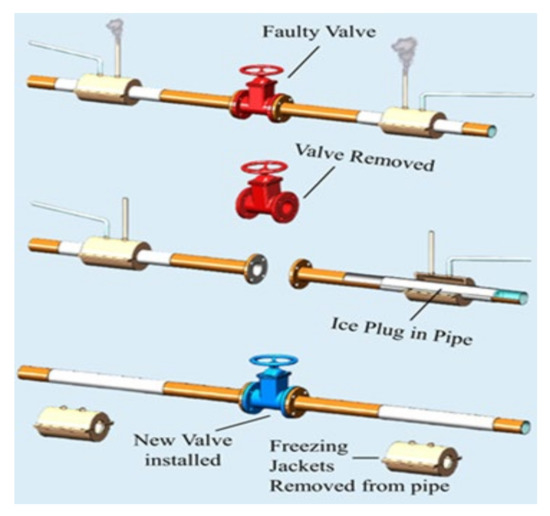 Figure 1 illustrates a (1) nitrogen vapor exit, (2) vapor nitrogen exhaust pipe, (3) ice plug, (4) freezing jacket, (5) liquid nitrogen injection, (6) inside the freezing jacket, (7) pressure meter, (8) ball valve, (9) tee water pipe, (10) inlet pipe, and (11) blind. Figure 1 describes the process of turning water into an ice plug. The water pressure was maintained at about 1 kg/cm2 for about 30 min. The two ends of the pipe covered by the frozen saddle belt produced about 5–7 cm of frost, respectively, allowing to fix the faulty section of the pipe. During the ice formation process, we checked the freezing time, control freezing temperatures, and measured the flow rate. The experiment was implemented at the maximum water pressure, and the temperature, time and flow rate data were recorded. A hydrostatic test was utilized to check the ice formation and the movement of the ice plug in the pipes. Figure 2 shows that, at the end of the freezing process, we can safely replace the faulty valve.