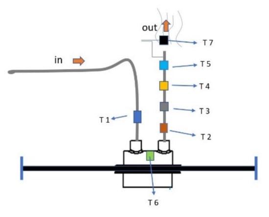 The first preliminary experiment conducted before the onsite fixing work was carried out is to install temperature sensors and record and analyze the temperature variations. In Figure 3, the experiment shows temperature sensor T1 on the surface of the inlet steel pipe, four sensors at the exhaust iron pipe, T6 on the surface of the jacket, and T7 at 8 cm above the exit. The exact locations of the sensors arranged from the water pipe centerline can be seen in Table 1. Figure 4 is the recorded temperature variations during the experiment. The environment temperature was 34.2 °C, and LN2 was injected at about −196 °C. The data showed that the temperature on the surface of the inlet pipe wall was not nearly as low as the temperature of the liquid nitrogen, because the poor thermal conductivity of steel reduced the environment air energy conduction to the inlet pipe wall.