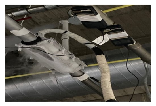 The second preliminary experiment conducted before the onsite fixing work was carried out to estimate the time needed for freezing and the liquid nitrogen consumption. For this experiment, a galvanized steel pipe diameter of 50 mm was used, which is the same as the one used in hospital water supply systems, and the water pressure inside the pipe was 3.3 kg/cm2. Usually, the challenge was to verify whether the water completely turned into ice inside the pipe. There are generally two ways to make sure: one is to measure the frost characteristics outside the pipe [23]. When water inside has completely turned into ice, the jacket and part of the pipe surface will be covered with frost. The patent acquired for such an experiment showed that the frost length on the pipe surface at either side of the jacket is 1.2–1.8 times the pipe diameter. This is a good way to judge the ice condition for onsite fixing work.