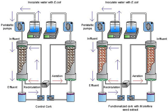 The M. oleifera seeds were provided by the Polytechnic University of Catalonia, and collected in the Canary Islands, Spain. Initially, the seeds were crushed, dried at 60 °C for 24 h and sieved to obtain a particle size of 0.9 mm. The stock solution was made of dried M. oleifera seeds in distilled water and NaCl (0.85%), achieving two concentrations of 5% and 10%, which were consecutively filtered using 40 µm filter paper [34]. Additionally, the granulated cork was cleaned with hydrochloric acid (HCl, pH 2), sodium hydroxide (NaOH, pH 10) and ethanol (96%) followed by three rinses with distilled water to remove the sediment. We worked with two particle sizes (3 mm and 5 mm), smaller and larger, respectively. The material was dried at 50 °C for 12 h and consecutively sterilized (15 min at 121 °C). Two hundred millilitres of the seed extract stock solution were added and the mixture stirred with a magnet, ensuring that the solution covered the filter material for 2 h. Subsequently, the material was washed with distilled water until part of the solution was removed and dried at 50 °C for 12 h [23].
