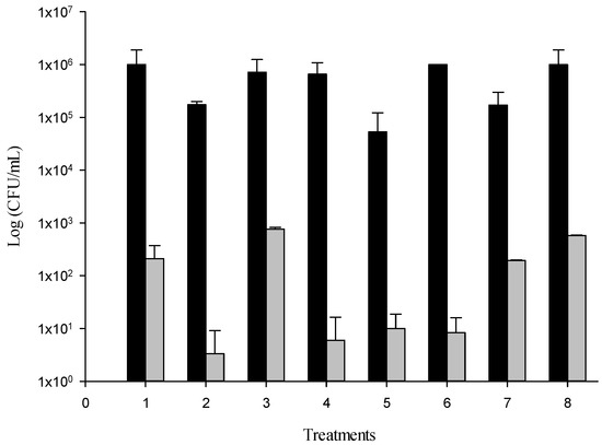 Bacterial load of the effluent water circulated through non-modified cork (control, black bars) and through the f-cork (grey bars) in the eight treatments. The initial E. coli count for the contaminated water was ~1 × 108 CFU/mL.