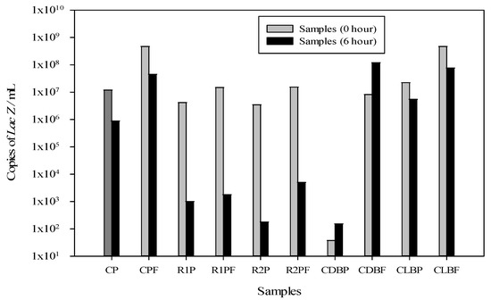 According to the CT displacement with PMA treatment and the qPCR assay, the results presented wide variation between the samples obtained for Control of dead bacteria with PMA (CDBP) and Control of dead bacteria without PMA (CDBF) at two times (0 and 6 h) (see Supplementary Material, shown in Tables S3 and S4). The CT value indicates the number of cycles in which the fluorescence generated in a reaction crosses the fluorescence threshold and, therefore, there is amplification of the LacZ gene.