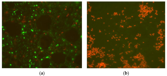 LIVE/DEAD Baclight test carried out with fluorescence microscopy from samples with cork functionalized with MoSe. Biofilter without f-cork (a), Biofilter functionalized with f-cork (b). Dead cells are stained in red, while green-stained cells are alive.