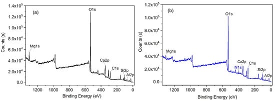 Figure 3 reveals the elemental compositions of the pristine and aminopropyl-modified slag determined by XPS. The XPS data reflect the composition of the topmost surface (usually several nanometers) of the samples [37]. Figure 3a exhibits the presence of the main constituent elements (Si, Al, Ca, Mg and O) in the pristine slag. The signal of C, which is not intrinsically a constituent element of slag, originates from the adsorption of C species in the atmosphere. For the aminopropyl-modified slag (Figure 3b), additional peak of N is detected at a binding energy of 399 eV [38,39], and the elemental concentration of C increases from 18.36% for the pristine slag to 26.4% (Table 5). This observation confirms that the aminopropyl groups were successfully incorporated onto the surface of slag.