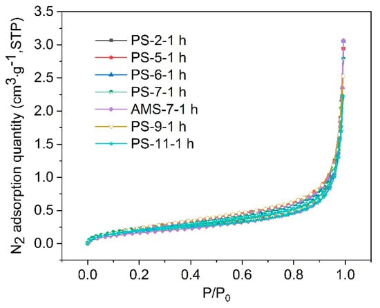 N2 adsorption–desorption isotherms of the slag. Note: the legend means that the pristine slag (PS) and the aminopropyl-modified slag (AMS) were treated in the aqueous solution with a pH of 2, 5, 6, 7, 9 and 11 for 1 h, respectively, at room temperature.