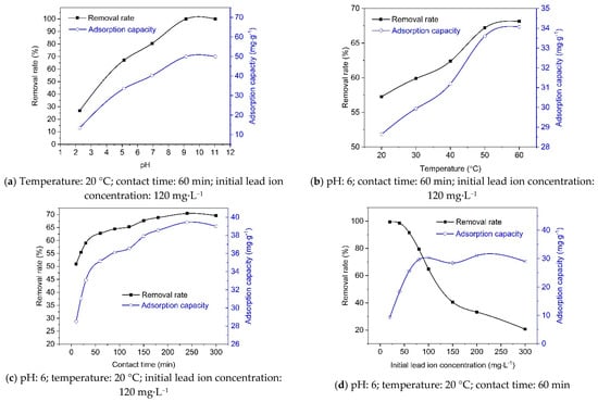 For the single factor analysis, the effect of pH, adsorption temperature, contact time and initial concentration of lead ions on the removal rate and adsorption capacity was investigated in detail by varying one factor while fixing the other three factors. The values of the single factors used in the experiments are listed in Table 2.