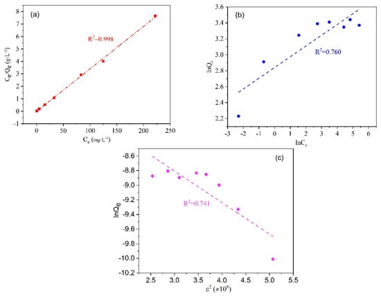 where Qm (mg·g−1) denotes the theoretical maximum adsorption capacity, Qe (mg·g−1) is the equilibrium adsorption capacity at the equilibrium concentration Ce (mg·L−1) and KL (L·mg−1) means the Langmuir constant related to binding strength.