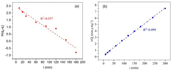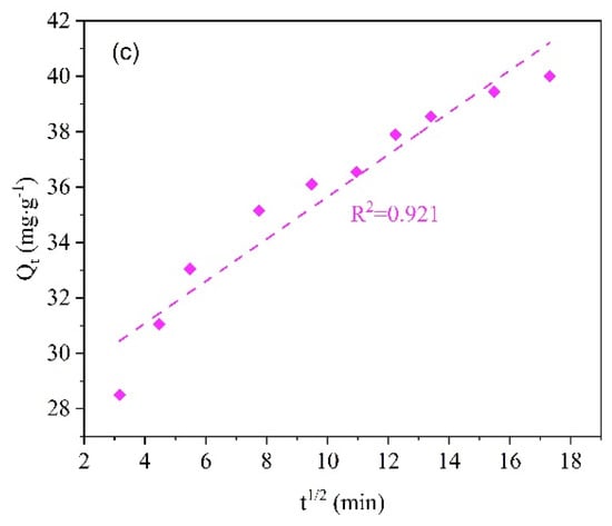 Pseudo-first-order, pseudo-second-order and intraparticle diffusion models, denoted in Equations (8)–(10), respectively, were adopted to characterize the adsorption kinetics [24,48]: