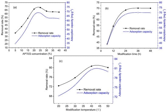 Three modification conditions, e.g., APTES concentration, modification time and modification temperature were investigated for their effect on the removal effectiveness of lead ions on the modified slag; the results are exhibited in Figure 9. The adsorption capacity increases significantly with increasing APTES concentration, reaching a maximum value of 68.35 mg·g−1 at the APTES concentration of 25 wt%, and then decreases slightly upon higher APTES concentration (Figure 9a). It is generally accepted that surface modification is realized via the condensation reaction between the surface hydroxyl groups of slag and the ethoxy groups of APTES. After condensation, the surface hydroxyl groups are replaced by aminopropyl groups and this tendency is much more pronounced at higher APTES concentration. Previous work has demonstrated that aminopropyl groups are more affiliative to lead ions than hydroxyl groups [28,30]. That is why the adsorption capacity increases after surface functionalization with more aminopropyl groups. However, excess APTES may generate steric hindrance, which could prevent some hydroxyl groups from being accessible to APTES molecules, thus leading to the incomplete surface modification and the slight decrease of adsorption capacity. Figure 9b shows that the adsorption capacity increases sharply at the first 24 h and reaches a relatively saturated value 24 h later. The rapid increase of adsorption capacity at the initial stage can be ascribed to the successful grafting of aminopropyl groups on the surface. The surface hydroxyl groups are completely consumed 24 h later so that more aminopropyl groups are unable to link to the slag surface. As exhibited in Figure 9c, the adsorption capacity rises gradually with increasing temperatures from 20 to 40 °C, due to the possibility that the condensation reaction between the hydroxyl groups and the APTES molecules are more favorable since the APTES molecules diffuse more rapidly in the solution at higher temperatures. A further increase of temperature to greater than 40 °C does not promote the adsorption capacity because no more hydroxyls groups are available for the residual APTES molecules. It is noted that the modification conditions have the same effect on the removal rate as that on adsorption capacity. The optimal modification conditions are obtained as follows: APTES concentration of 25 wt%, modification time of 36 h and modification temperature of 40 °C.